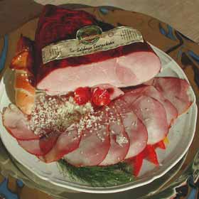 gebraten. Der Schinken erhält eine typisch dunkle Rauchfarbe,